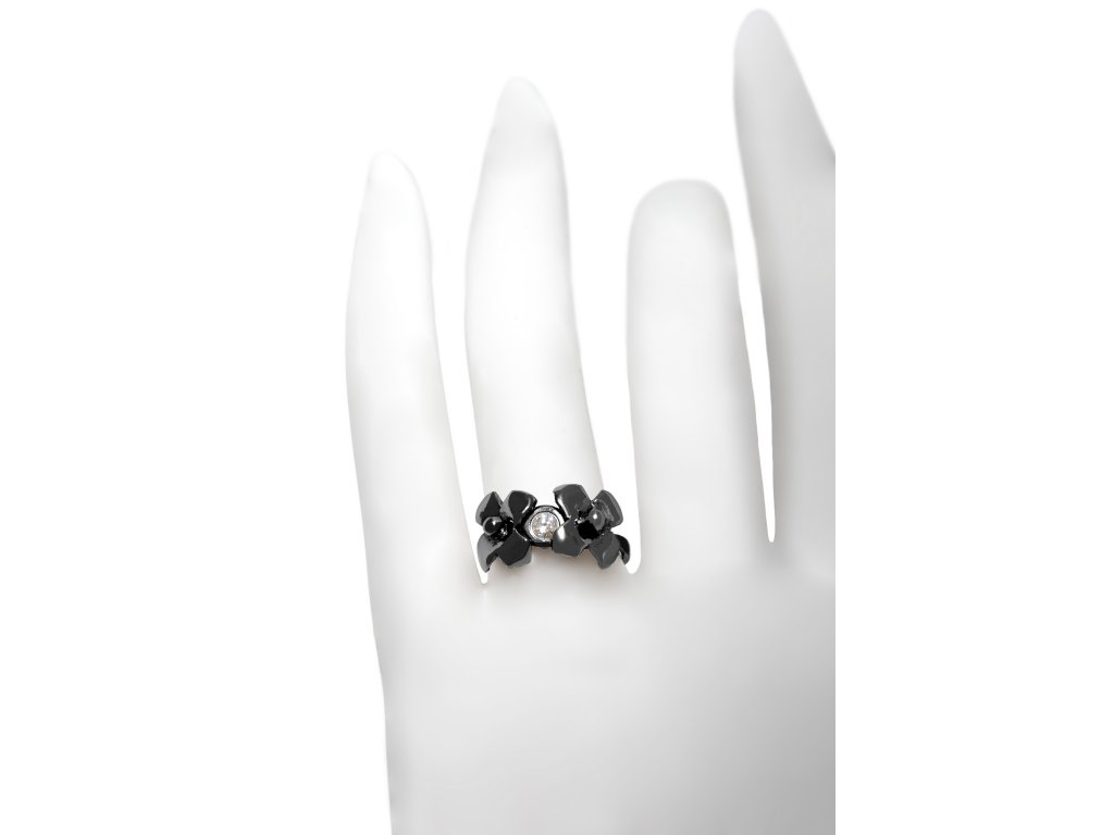 The flower is 1 cm large. Including the stone, the crown of the ring is 2.5 cm wide. The ring is made of yellow gold 585/1000, 14K. It is possible to make them from silver, matte or with surface treatment, or several flowers together. The diamond has a diameter of 0.3 mm.