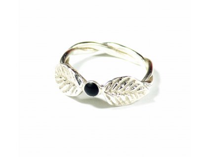 Jemmný černý dámský stříbrný smaltový prsten s lístky ze stříbra o ryzosti 925/1000 a váze 3 gramy je zdoben černým smaltem místo kamene.
