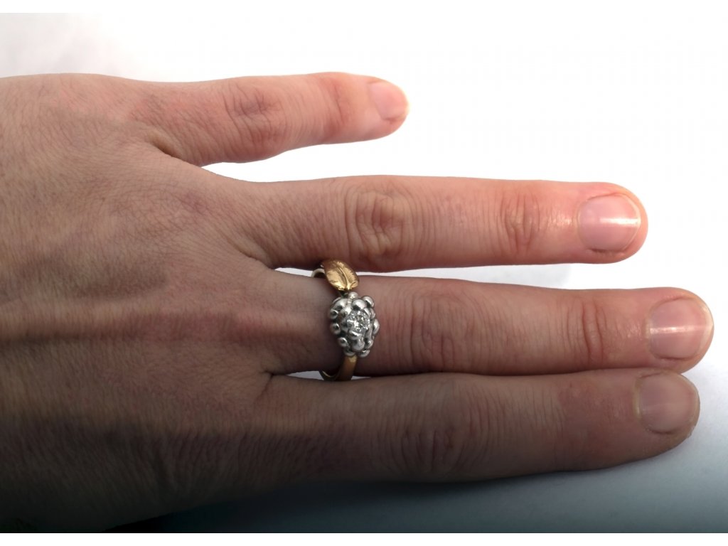 Zásnubní prsten s diamantem a motivem vinné révy. Au 585/1000, váha 5 gramů.