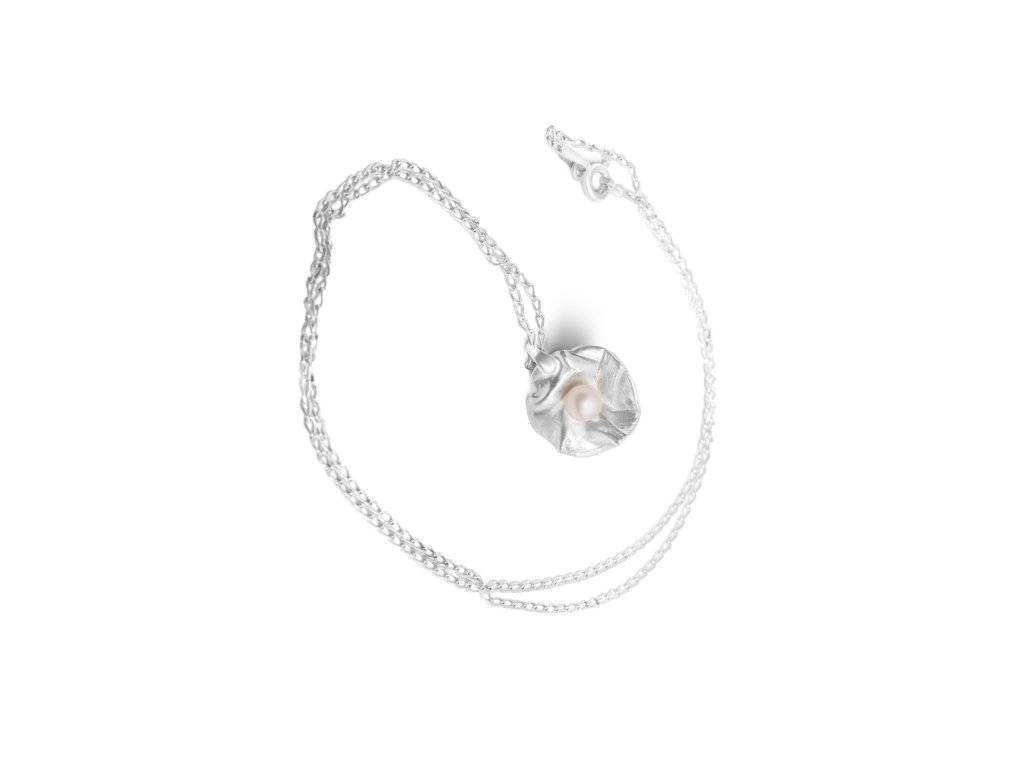 Náhrdelník je vyroben z lehkého plechu, pomačkán tak, aby byl pohodlný při nošení. Medailon je široký 2 cm a osazen sladkovodní perlou. Každý kus je tvarován ručně, takže je i jedinečným originálem. Lze jej vyrobit i ve zlatě, v jiné šíři či s povrchovou úpravou.